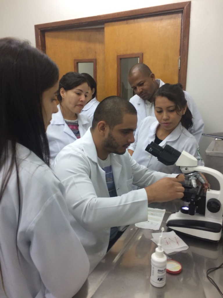 Estudantes do 6° Período de Medicina Veterinária realizando exame laboratorial na aula da Professora Flávia Volpato – Patologia Clínica de pequenos animais.