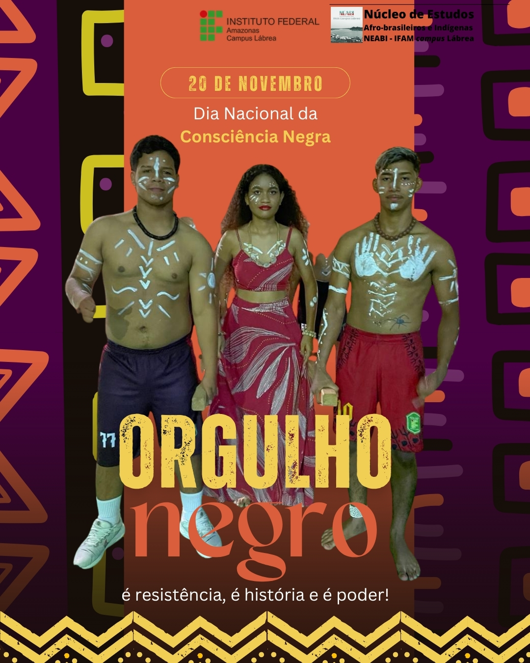 O NEABI do IFAM – Campus Lábrea homenageia, com profundo respeito, cada discente afro-brasileiro que fortalece este Instituto com sua presença, força e beleza. Em meio à imensidão da Amazônia, vocês afirmam identidades potentes e constroem caminhos de resistência que inspiram toda a comunidade acadêmica.