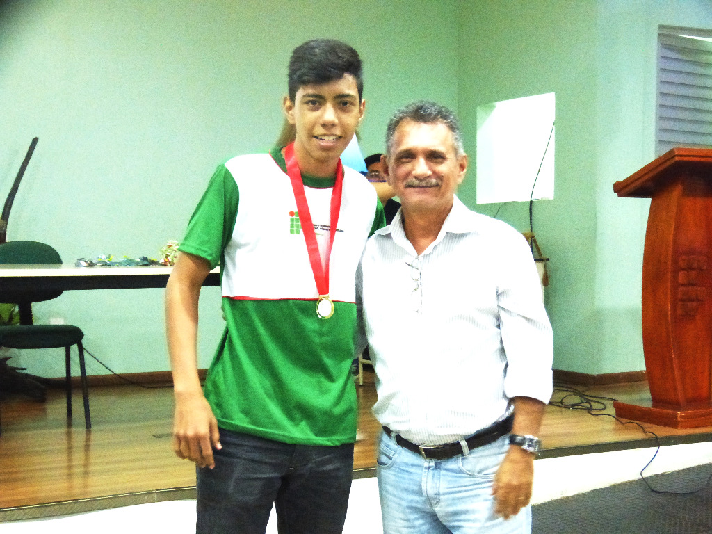 Diretor do Campus Parintins Gutemberg Ferraro entregando a medalha de ouro ao aluno campeão da OBA